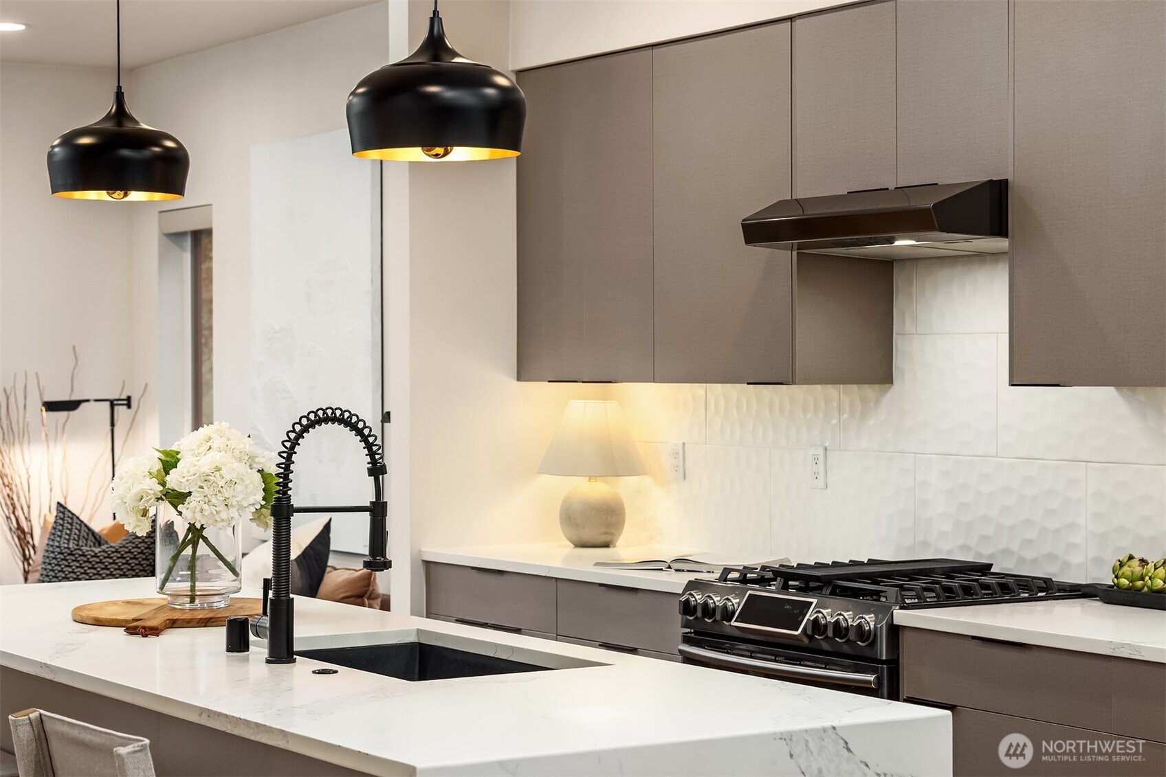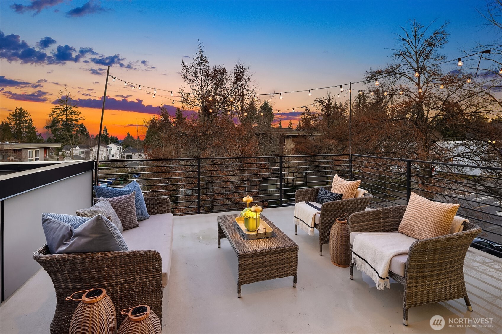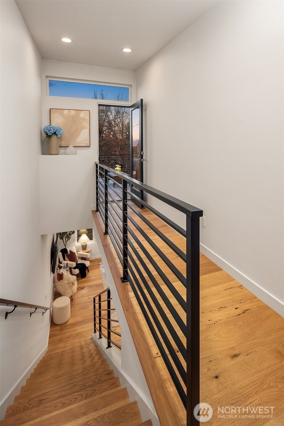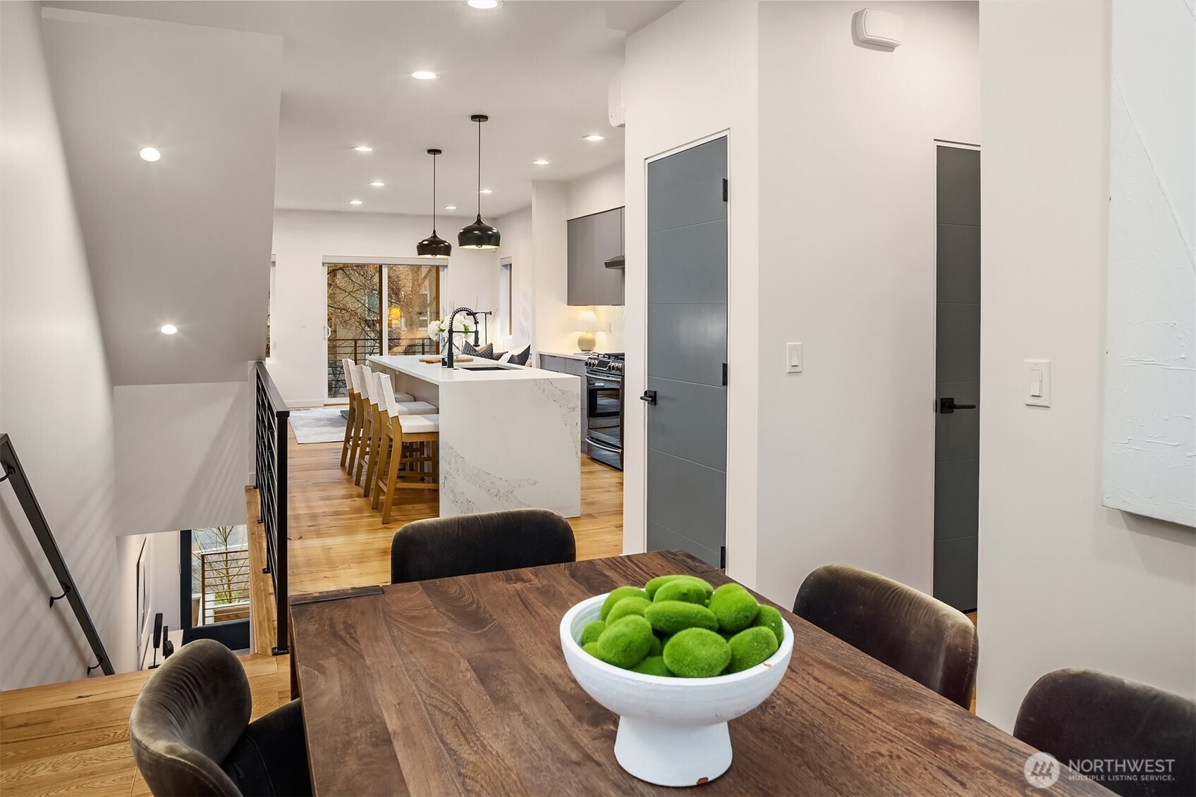 A rare Seattle find, this Medici Architects-designed Maple Leaf home lives far larger than expected. A bright, south-facing end unit, it's drenched in natural light and designed for effortless entertaining. The open floor plan is anchored by a chef's kitchen with quartz counters, gas range, stainless appliances, and a true entertainer's island. A chic powder room off the main living area adds a level of ease and polish rarely found in homes like this. The entry-level second bedroom offers ideal guest or office flexibility, while upstairs the primary suite feels like a quiet retreat, complete with a luxurious bathroom and custom Elfa walk-in closet. Both bedrooms are ensuite. Hardwood floors, custom blinds, on-demand tankless hot water, and efficient ductless heating and A/C elevate everyday living. An oversized one-car garage easily doubles as a gym or flex space, and the **rooftop deck, just one level from the living space**creates seamless indoor-outdoor flow. Enjoy excellent proximity to Maple Leaf shops, I-5, Green Lake, light rail, Maple Leaf Park, dining, and transit. Big living. Sun-filled. Truly rare.